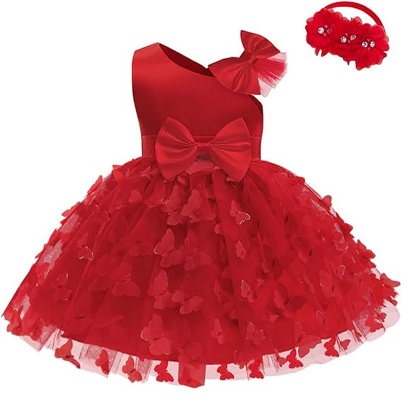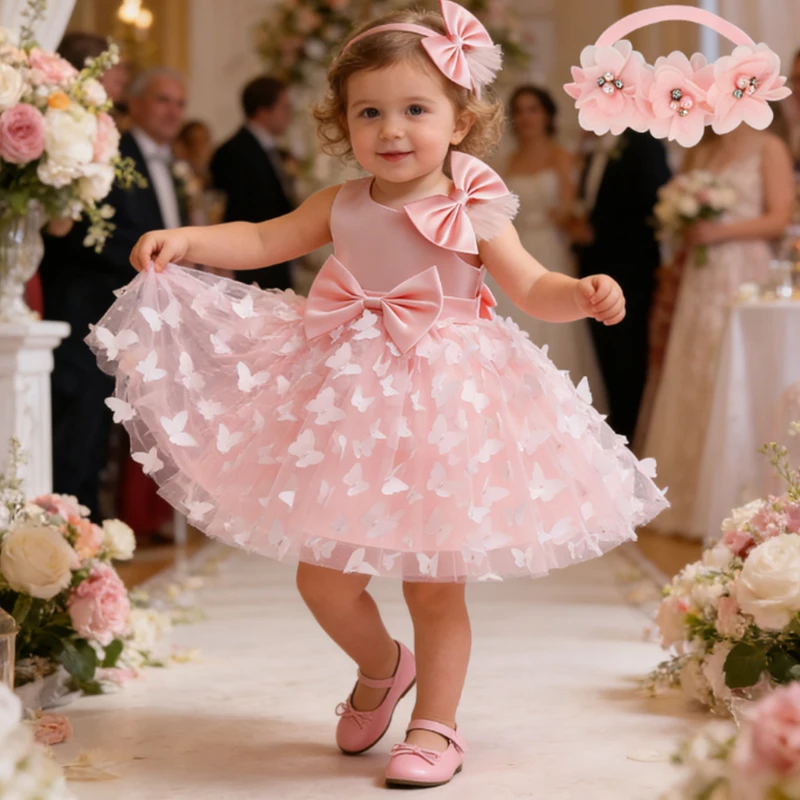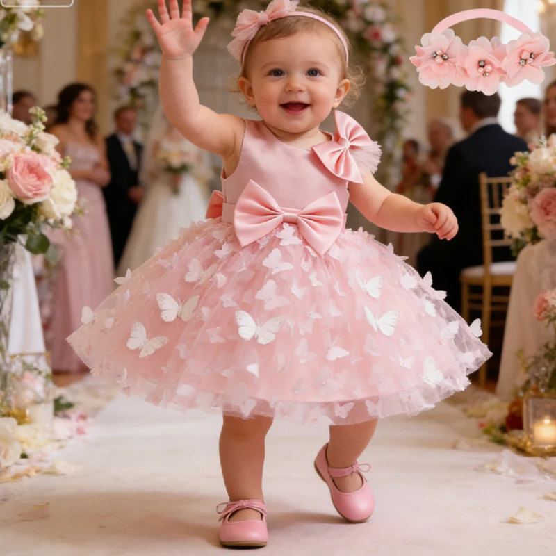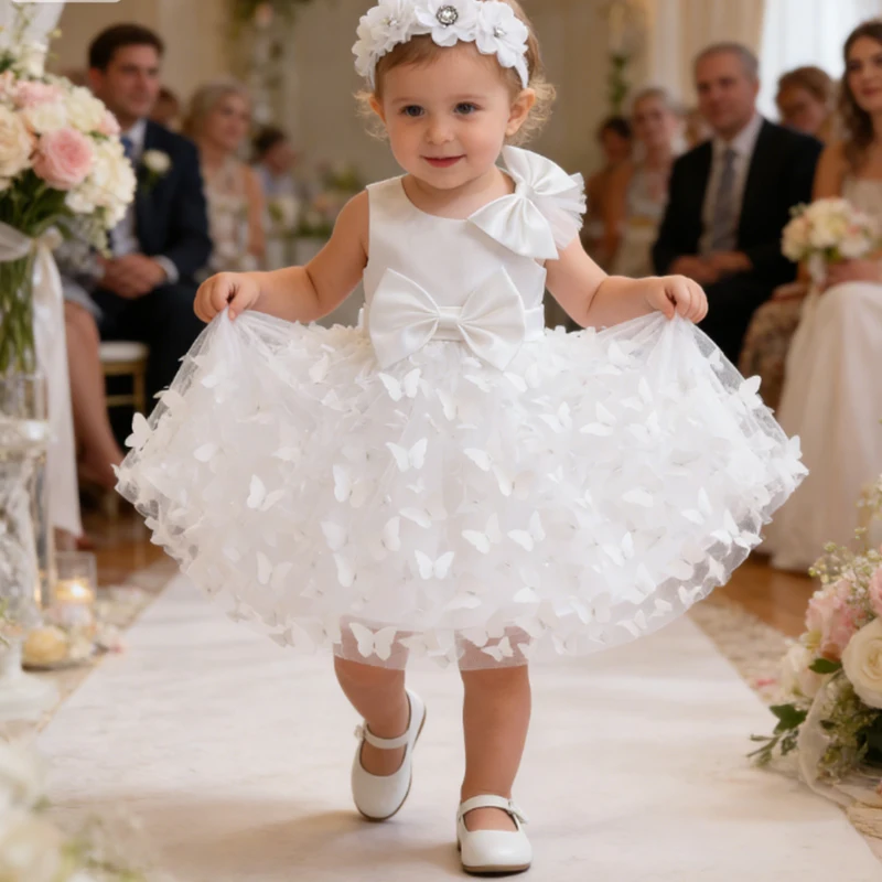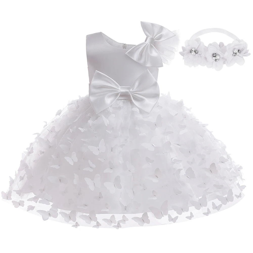White Wedding Baby Girl Dress Bowknot Butterfly Tutu Dress Infant Toddler Flower Girls Baptism Birthday Dresses With Headband